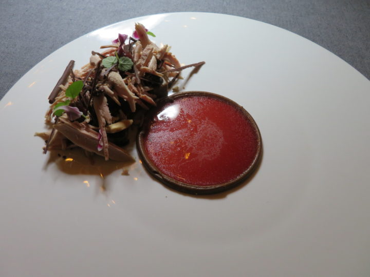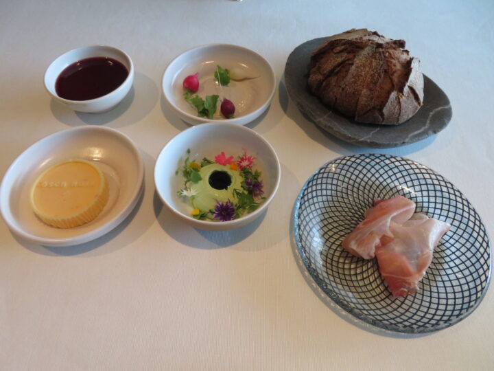 Als eines der wenigen herausragenden Lokale setzt Manuel Ulrich in seinem Ösch NOIR weiterhin auf eine opulente Brotauswahl, die fast schon einen eigenen Gang darstellen könnte. Unter den durchweg reizenden Begleitern hatte vor allem das unter einem Cassisgelée versteckte Parfait von Entenleber enormes Suchtpotential, doch auch der wahrhaft exzellente Schinken vom Schwäbisch-Hällischen Landschwein und der Kräuteraufstrich trugen ihren Teil zur Aufwertung der anderswo meist routiniert wirkenden Brotauswahl bei.
