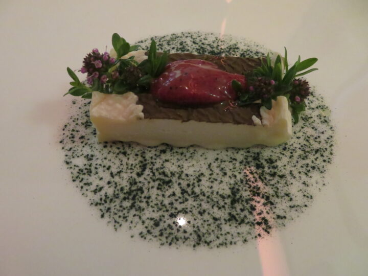 Eigenständige Käsegange sind in den letzten Jahren meist noch etwas rarer geworden als sie es ohnehin schon waren, doch Detlef Schlegel gehört noch immer zu den letzten unverdrossenen Zeitgenossen, die nicht nur daran festhalten, sondern dabei grundsätzlich auch etwas Wichtiges auszudrücken haben. Der normannische Ziegenkäse Ove Japonais ist ohnehin schon äußerst selten anzutreffen, doch als geradezu genial empfand ich das Pulver aus Spirulina-Algen darunter. Des Chefs profunde Kenntnisse rund um seltene Produkte machte sich aber auch beim subtilen Einsatz von Berberitzensorbet und Ysop-Bohnenkraut bemerkbar, so dass als Ergebnis dieser Eingebung ein praktisch beispielloser und schwer beeindruckender Teller unterm Strich stand.