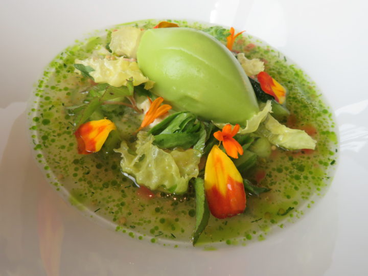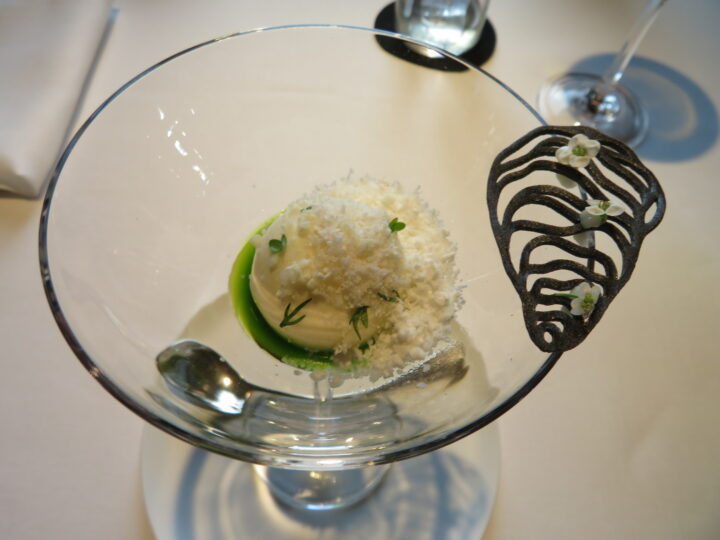 Zu den Zeiten von Harald Wohlfahrt nahm der grüne Trend erst allmählich an Fahrt auf, weshalb in jenen Jahren der Standard bei vegetarischen Gerichten noch vergleichsweise niedrig angesiedelt war. Natürlich besinnt sich die weltbekannte Schwarzwaldstube weiterhin zurecht ihrer Wurzeln, die nun einmal in der französischen Küche liegen, aber unter Torsten Michel hat sich der Stellenwert von fleisch- und fischlosen Tellern enorm erhöht. Bestes Beispiel dafür war die aus einfachsten Produkten ersonnene Kreation rund um ein Sorbet von Kopfsalat, das von einem Trio aus grünem Apfel, Gurke und grünen Tomaten so duftig und facettenreich begleitet wurde, dass man selbst ohne die weitere Verfeinerung mit einem Chardonnayessig von einem Ausnahmegericht in jeder Hinsicht hätte sprechen können.