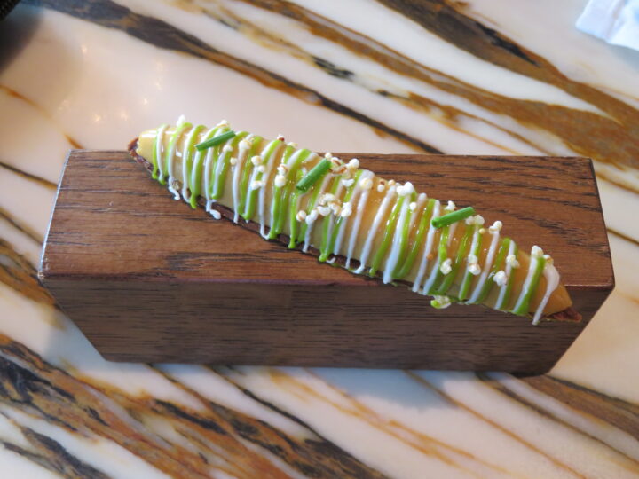 Was für eine Eingebung! Ein aus Koshihikari-Reis, Jakobsmuscheltatar und Kaluga-Kaviar aufgeschichteter Sockel unter einer knusperdünnen Wabe verschmolz dank einer leichten Rauchcrème, etwas Sencha-Tee und hauchzartem Vanilleduft zu einer unvergleichlich eleganten Kreation, die es verständlicherweise längst zum Signature Dish gebracht hat! Lassen Sie sich das Gericht, das erfreulich oft auf der Karte steht, bloß nicht entgehen! Unfassbar, wie hier atemberaubende Leichtigkeit und extreme geschmackliche Dichte zusammengeführt werden!