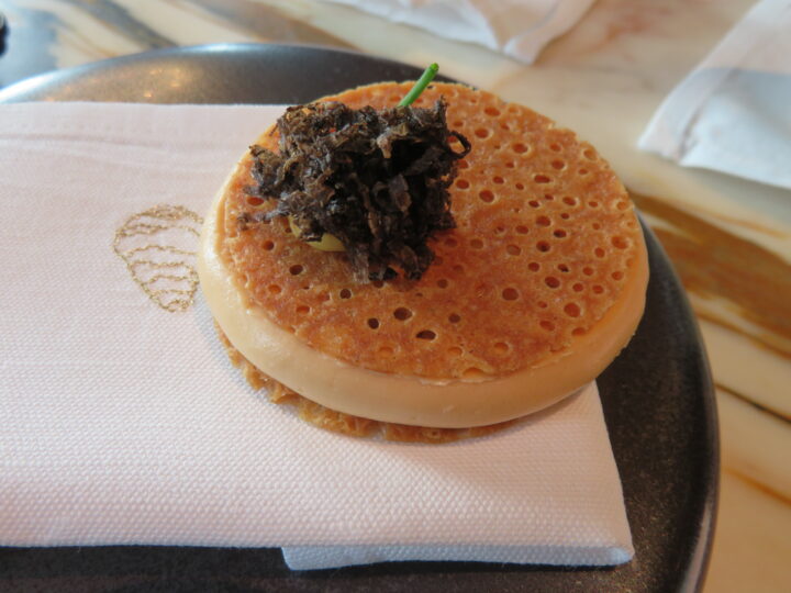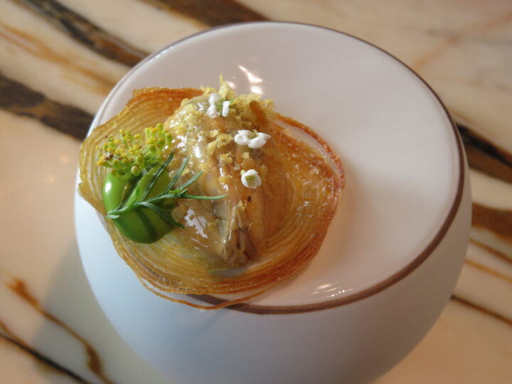 Derart viel Aufwand in den einleitenden Reigen investieren nur die wenigsten Chefs, doch Viki Geunes vom belgischen Dreisterner Zilte scheut schon zum Auftakt keine noch so große Mühe! Das Ergebnis rechtfertigt jeden Aufwand: seien es die eigenwillige Paella mit Reiscrème und Thunfisch oder Crème von Nordseekrabben mit Mimolette in zwei knusperdünnen Scheiben. Auch mit der ungewöhnlichen Kombination von Umeboshi, Räucheraal und Foie gras oder eine Art Rösti mit Schnecke und Muschel bewies der Chef großen Mut, der zweifellos in einer geeisten Irish-Mor-Auster mit Kokos, Blumenkohl und Dill gipfelte.