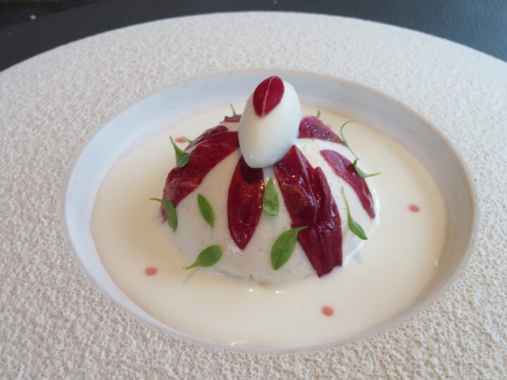 Man möchte es fast schon als furchterregend bezeichnen, in welche Höhen Thomas Schanz die Messlatte bei seinen kalten Amuses inzwischen hängt. Auch sein neuester Beitrag rund um Ziegenkäsemousse mit Walnusstatar, einem Veilcheneis und Treviso wirkte so erfrischend anders, fast spontan und doch so ergreifend umgesetzt, dass man meinte, man habe noch keine vergleichbare Komposition bisher erlebt und doch fraglos ein Meisterwerk vorgesetzt bekommen.